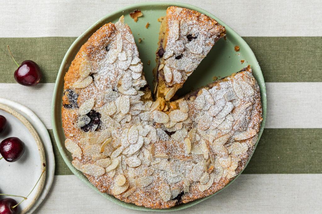 For a summery gluten-free cake, this cherry cake is one I was making long before we were gluten-free. A light almond meal / ground almond cake is studded with fresh cherries, and then sprinkled with flaked almonds for crunch. Delicious for afternoon tea or as dessert with a scoop of vanilla ice cream on the side.